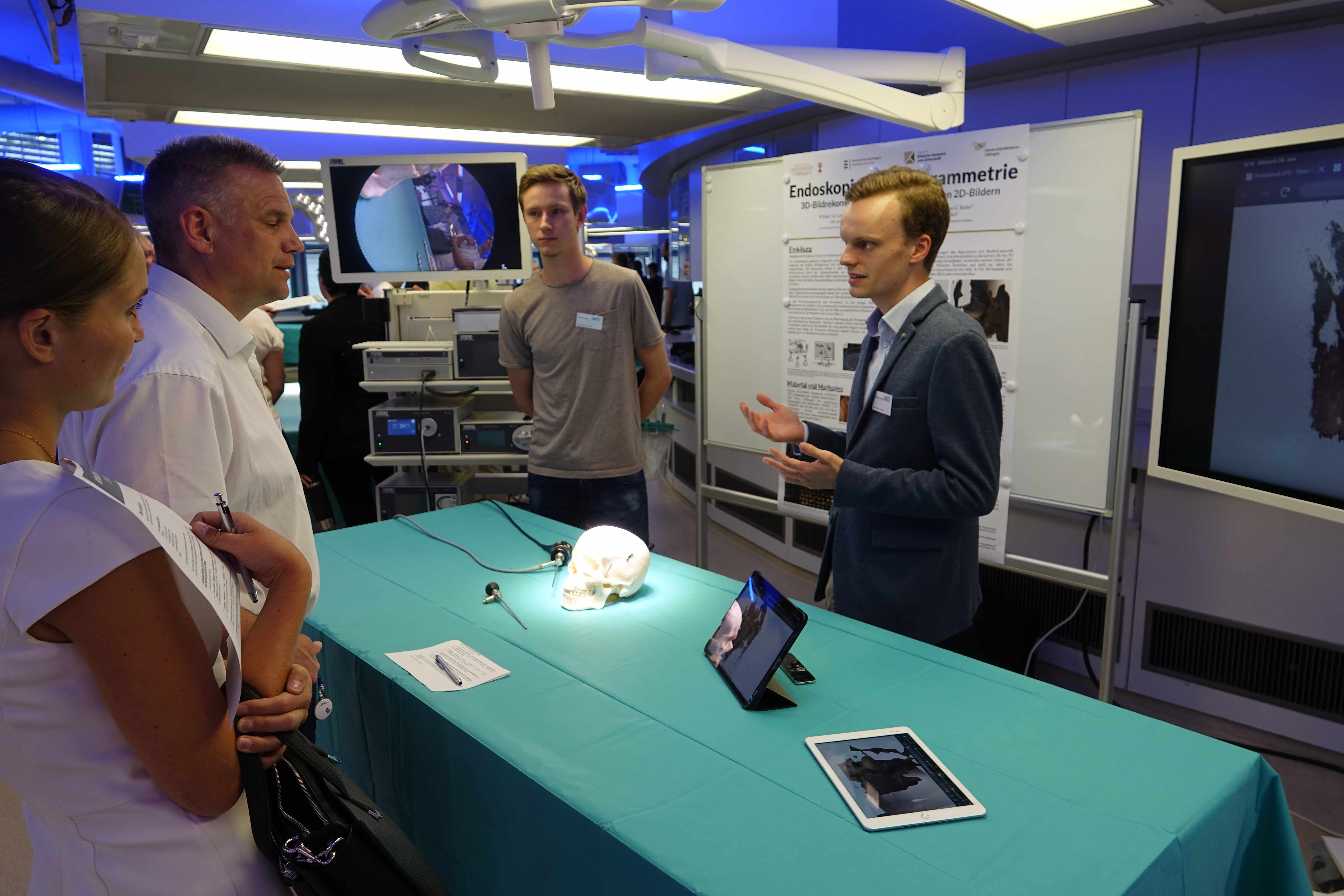 Es fanden sich vier Gruppen zusammen, die in nur zwei Monaten seit dem Kickoff-Meeting am 18. April 2023 spannende Problemlösungen erarbeiteten. In kurzen Pitches stellten sie ihre Vorhaben im Rahmen des aktuellen „Einschnitte-Einblicke“-Workshops vor, der zum Thema Digitalisierung, Fusion und künstliche Intelligenz (KI) am 28. Juni 2023 am Institut für Klinische Anatomie der Universität Tübingen stattfand. Der BioMedTech-Verein ist gemeinsam mit der BioRegio STERN Management GmbH und dem IZST - Interuniversitäres Zentrum für Medizinische Technologien Stuttgart – Tübingen Veranstalter dieser äußerst erfolgreichen Workshop-Reihe, die 2016 ins Leben gerufen wurde. Die erstmalige Kombination mit den Präsentationen des Ideencamps zum gleichen Thema kam hervorragend an und führte zu einem deutlich höheren Anteil jüngerer Teilnehmenden. Die Gäste wechselten nach der ersten Diskussionsrunde, an die sich die Pitches des Ideencamps anschlossen, in den OP der Anatomie. Hier konnten sie einerseits wie gewohnt bei Präsentationen an anatomischen Präparaten mit Ärzten die Medical Needs erörtern und andererseits mit den vier Teilnehmergruppen des Ideencamps diskutieren, die ihre Ansätze an jeweils eignen Stationen präsentierten.