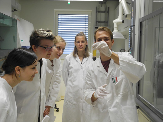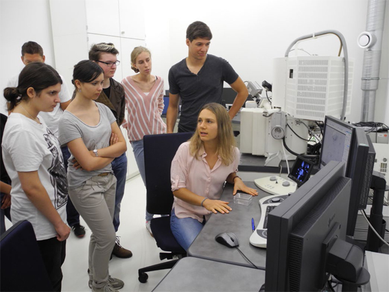 Zusätzlich zum Zentrum für Nanoanalytik lernten die Schülerinnen und Schüler den Forschungscampus BioMedTech auf ihrem Rundgang kennen. Das zweite Leuchtturmprojekt im Rahmen der RegioWIN-Förderung hat zum Ziel, die Region Neckar Alb zu einem führenden Forschungsstandort der Biomedizintechnik zu entwickeln und die Stärken der Region auszubauen, die sich aus der Zusammenarbeit von Biotechnologie und Medizintechnik ergeben. Auf dem Campus arbeiten regional ansässige Unternehmen der Medizintechnik und Biotechnologie und Institutionen der Grundlagen- und angewandten Forschung gemeinsam daran, neue Materialien für die Medizin zu entwickeln.